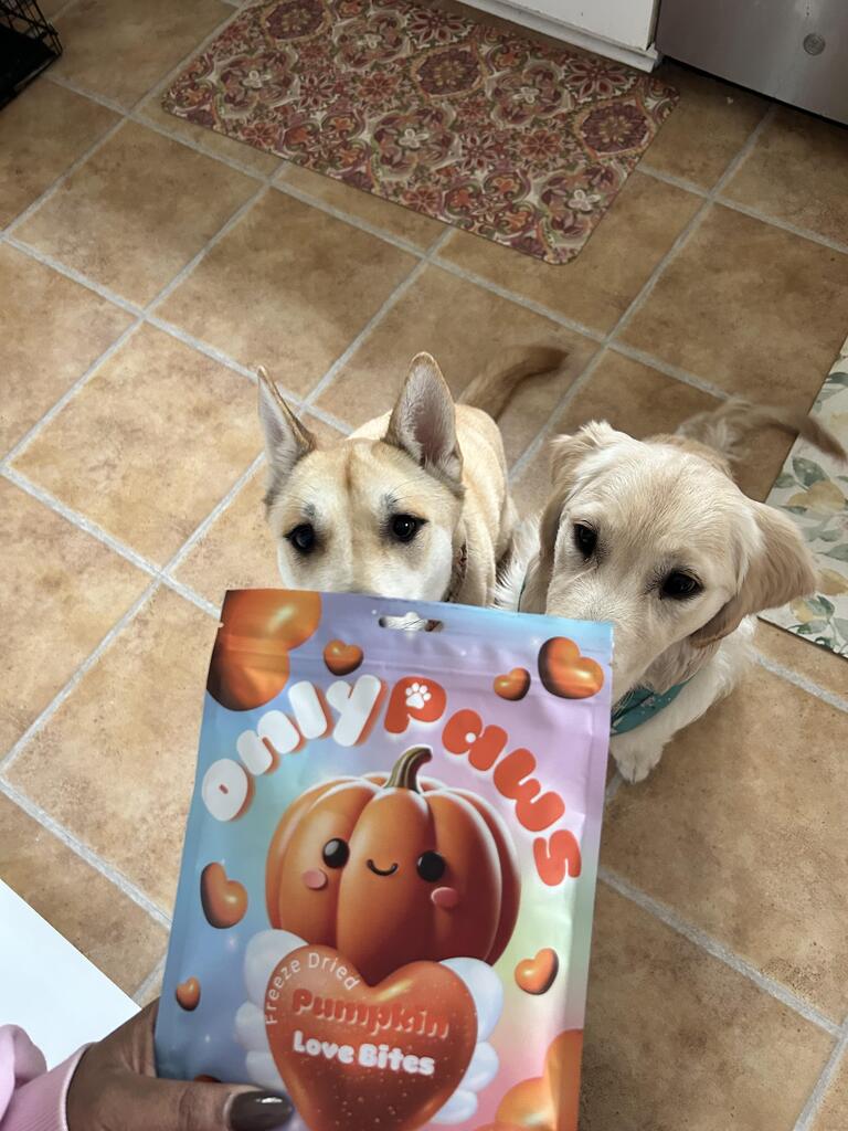 The freeze dried pumpkin love bites are my dog's second favorite treats. I love that they're bite sized and perfect for my senior dog since she is missing a few teeth. They're packaged in a sealed ziplocked bag which is perfect for storage as long as it's kept in a cool place. I recommend to any fur baby. The freeze dried pumpkin love bites are my dog's second favorite treats. I love that they're bite sized and perfect for my senior dog since she is missing a few teeth. They're packaged in a... The freeze dried pumpkin love bites are my dog's second favorite treats. I love that they're bite sized and perfect for my senior dog since she is missing a few teeth. They're packaged in a sealed ziplocked bag which is perfect for storage as long as it's kept in a cool place. I recommend to any fur baby.