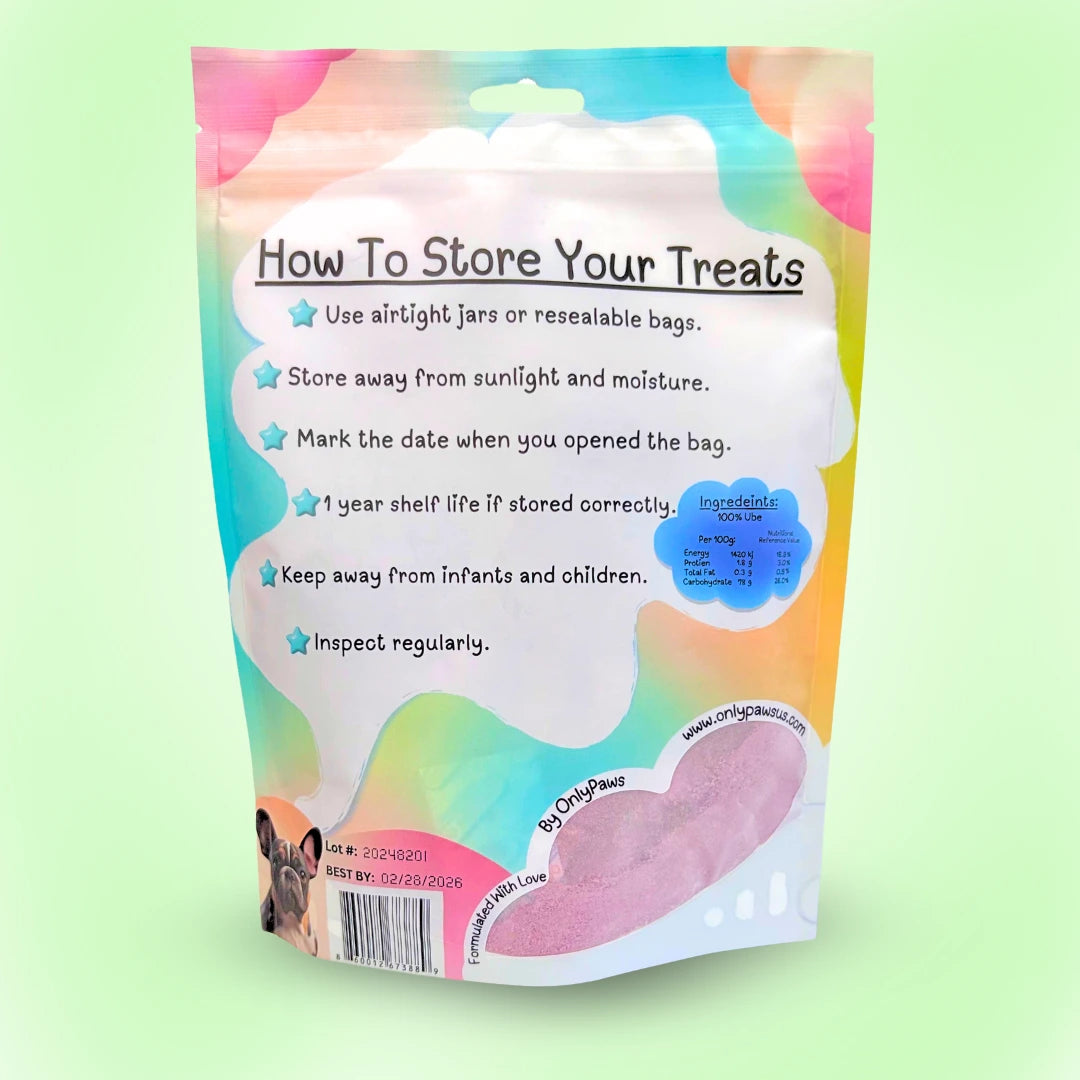 🚨 Disclaimer: Our Ube treats are made in small, limited batches using nothing but 100% Ube. Because they are a single-ingredient then freeze-dried treats, some natural crumbling or powdering may occur during shipping. This doesn’t affect quality or safety. Any smaller pieces and or powder can still be enjoyed as a meal topper or sprinkled over food.